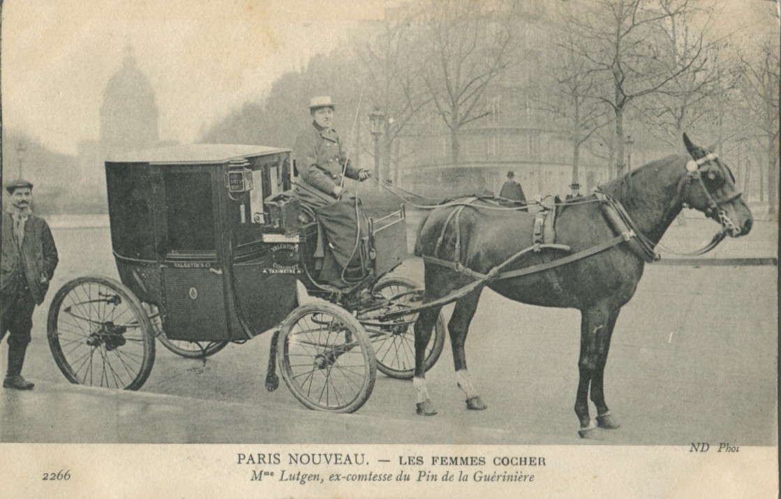« La plus célèbre des Femmes-cocher a été Mme Lutgen, Une aristocrate qui avait connu des temps difficiles et se tourna vers le métier de cocher pour gagner sa vie. Dans sa jeunesse, Mme Lutgen était une cavalière accomplie et n’a pas eu de difficulté à se qualifier en tant que conducteur. »
